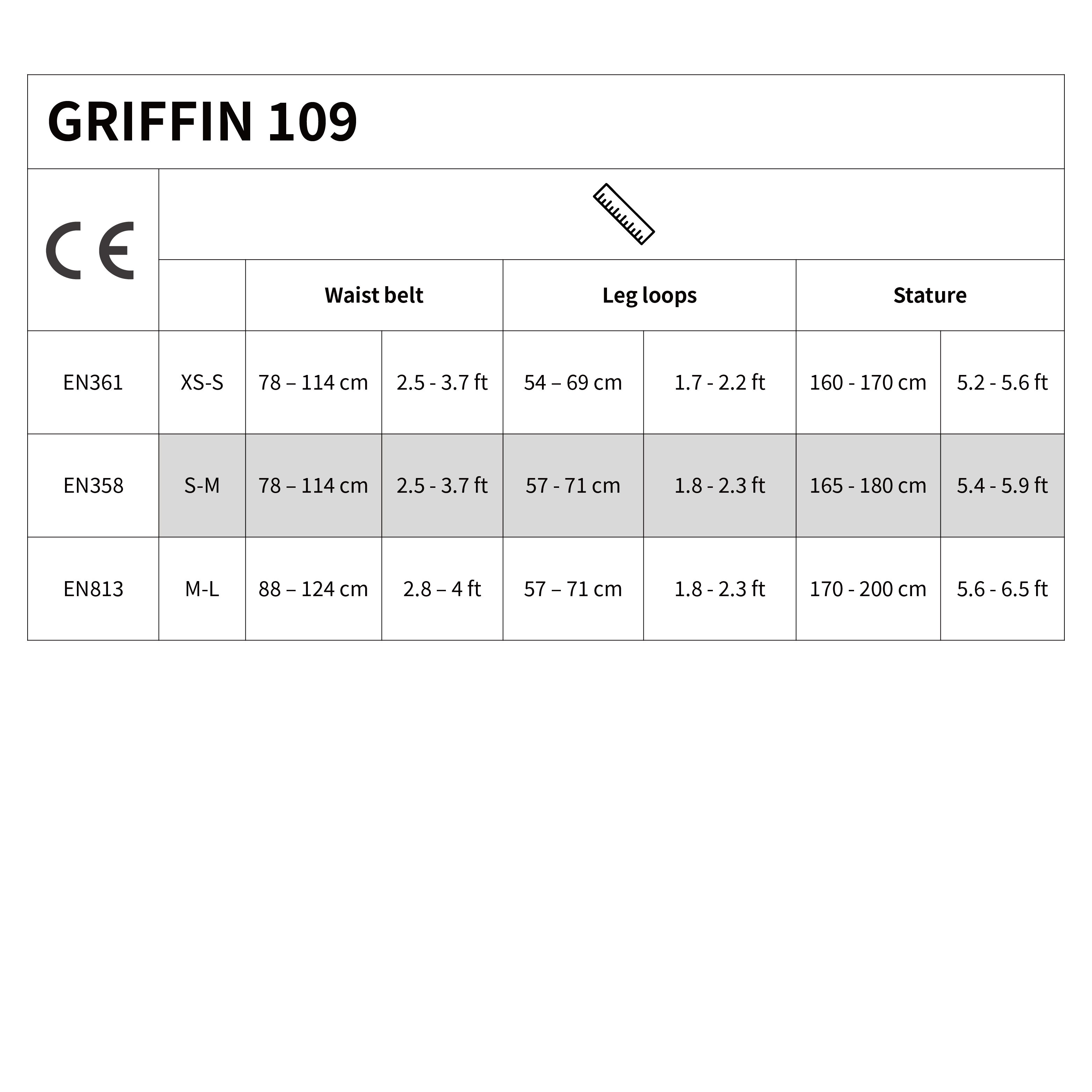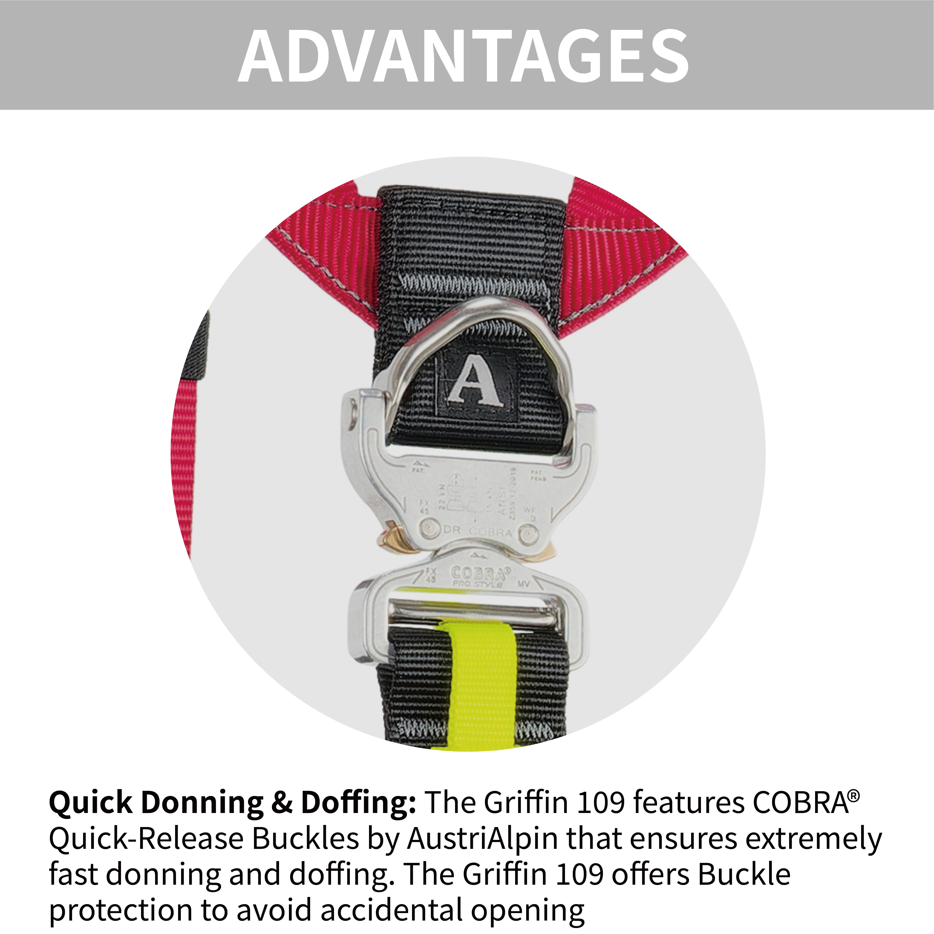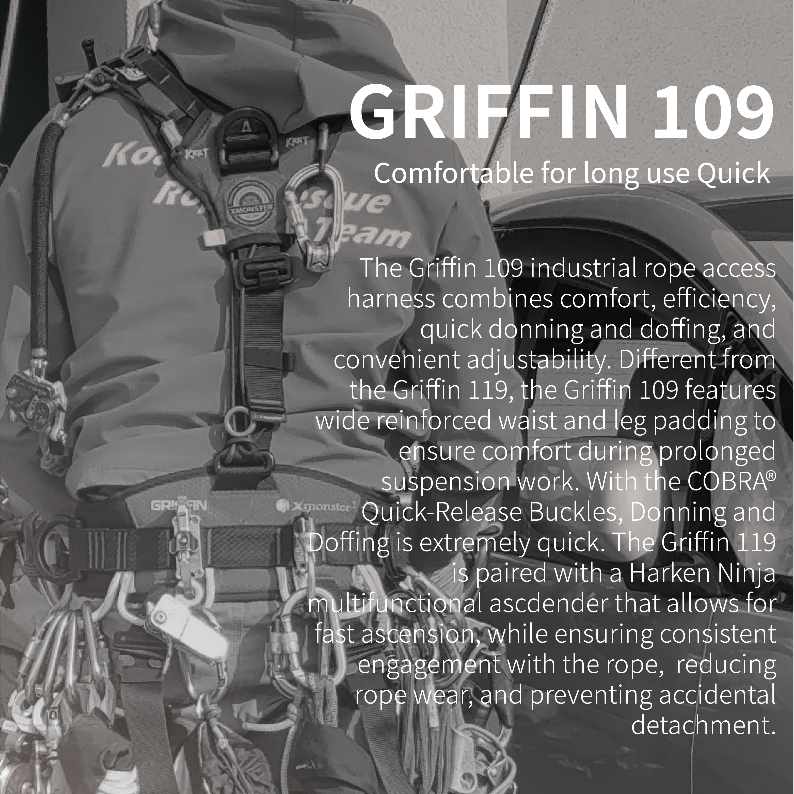 The Griffin 109 industrial rope access harness combines comfort, efficiency, quick donning a doffing, and convenient adjustability.