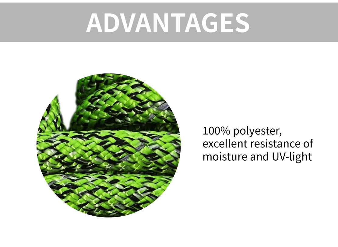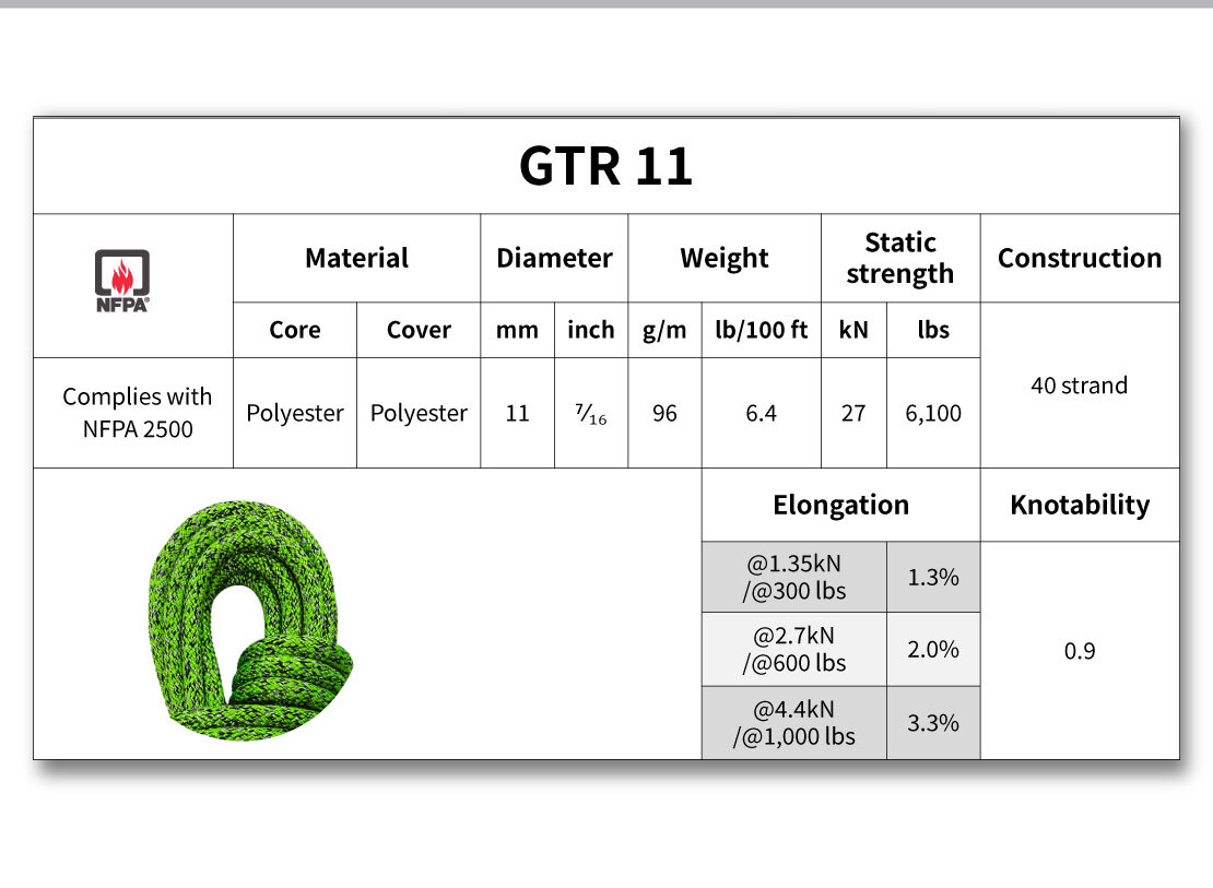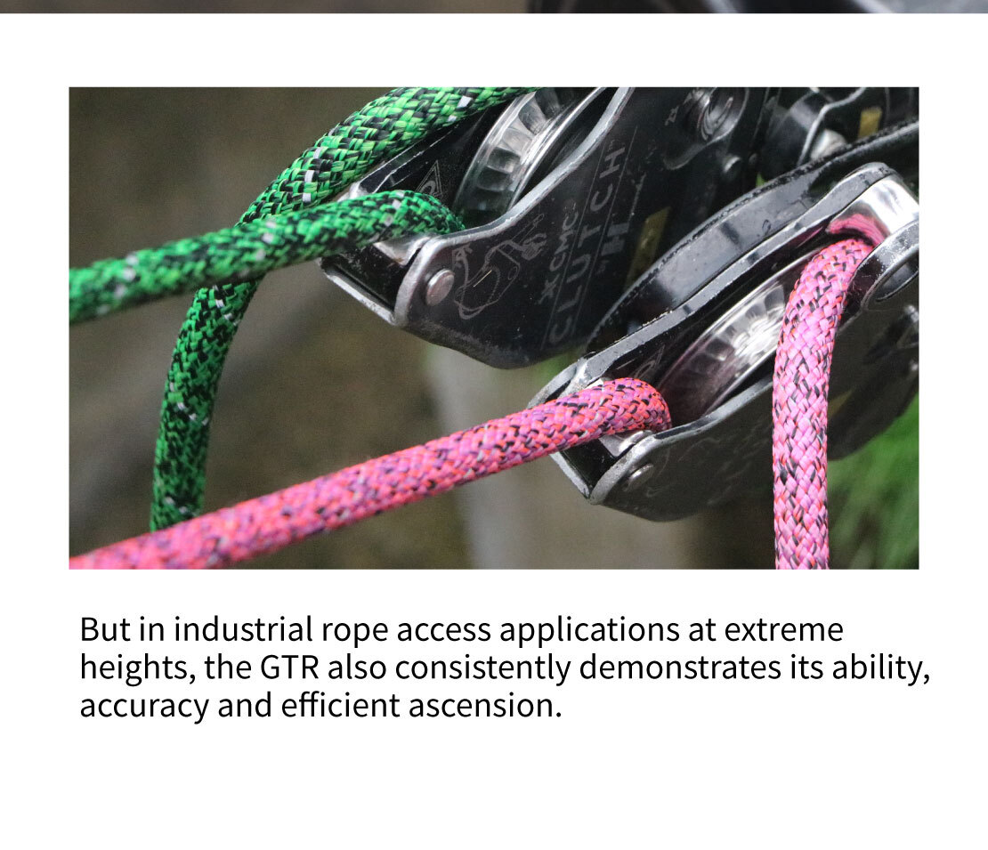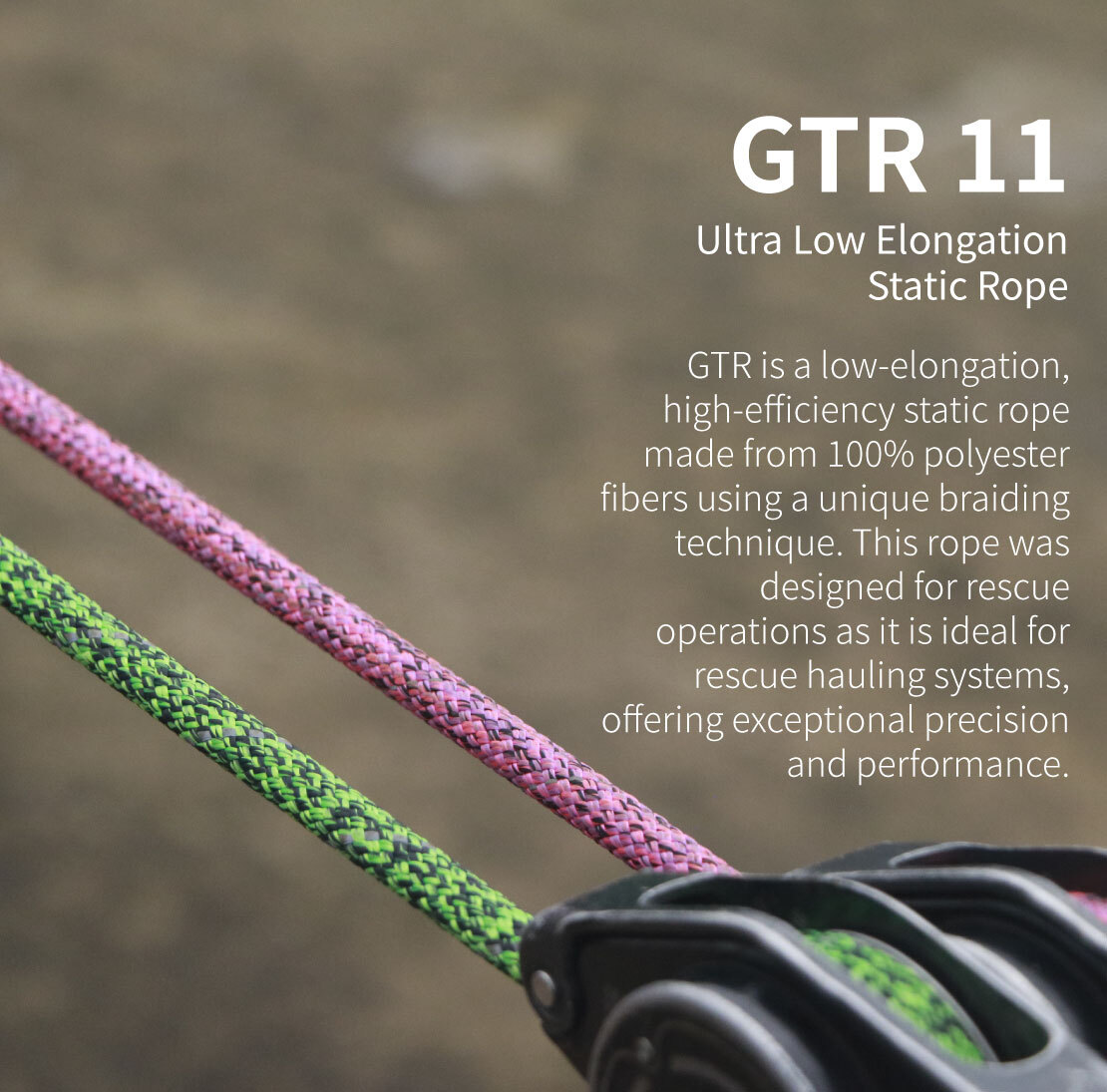 GTR is a low-elongation, high-efficiency semi-static rope made from 100% polyester fibers using a unique braiding technique.