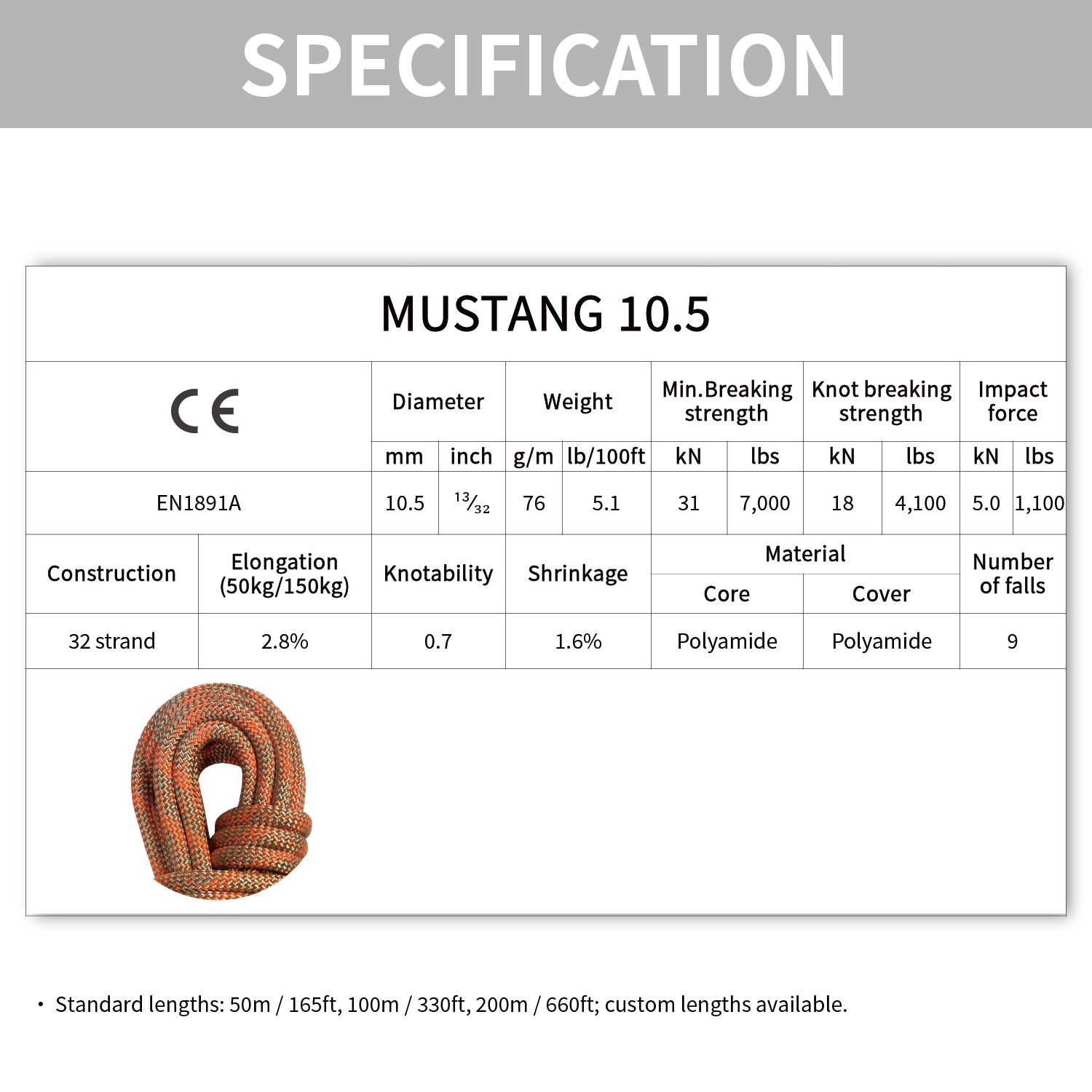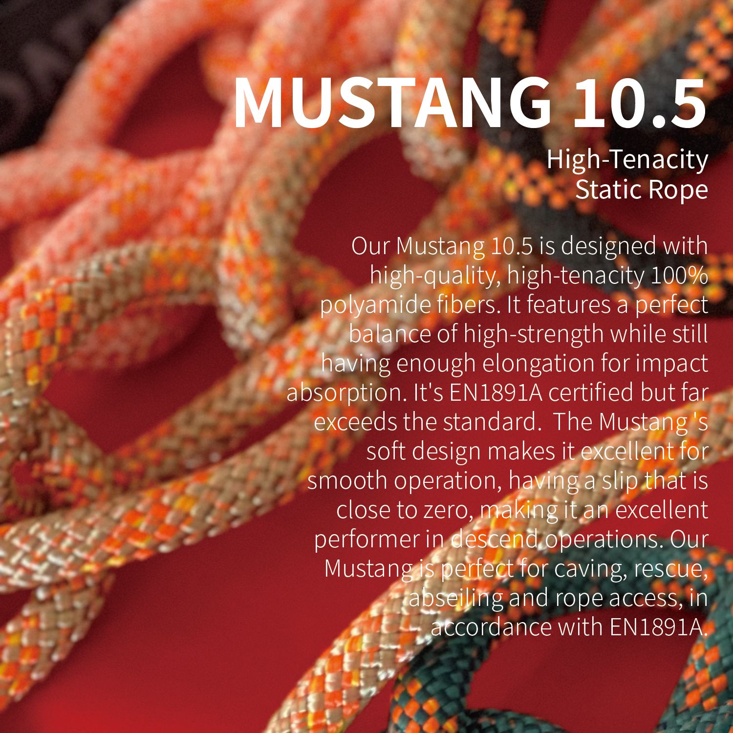 Our Mustang 10.5 & 11 is designed with high-quality, high-tenacity 100% polyamide fibers. It features a perfect balance of high-strength while still having enough elongation for impact absorption.